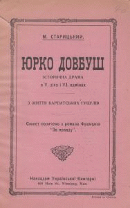 Юрко Довбуш історична драма в 5 діях і 6 одмінах з життя карпатських гуцулів М. Старицький ; сюжет позичено з романа Францоза "За правду"